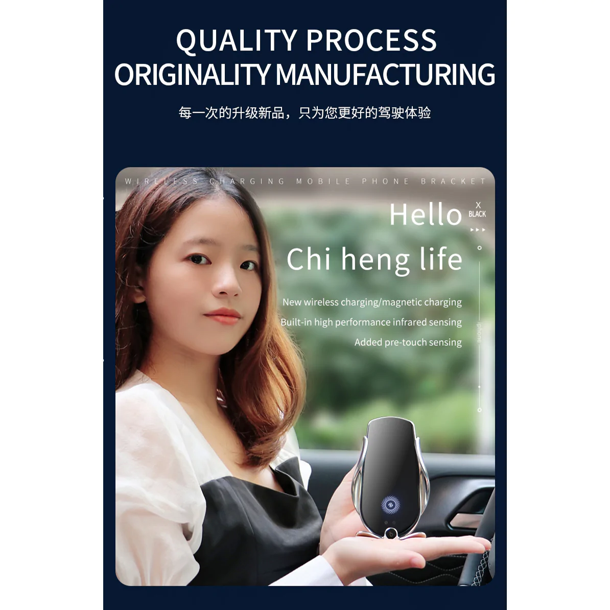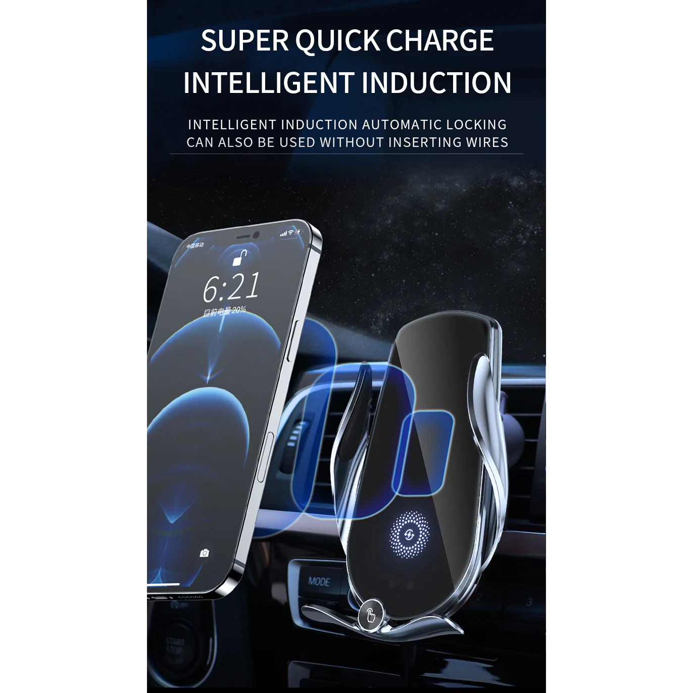 đ ăOne hand operationăThe infrared sensor of the wireless car charger at the bottom will automatically release the clip and tightly clamp the phone. The car phone holder is equipped with a 360 degree wireless charging rotating ball to help you find the most suitable angle for safe driving. When the mobile phone is installed near the wireless charger of the ventilation hole, the infrared sensor at the bottom will automatically release the clip and tightly clamp the mobile phone.