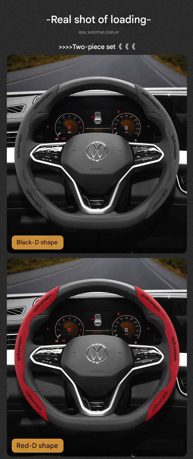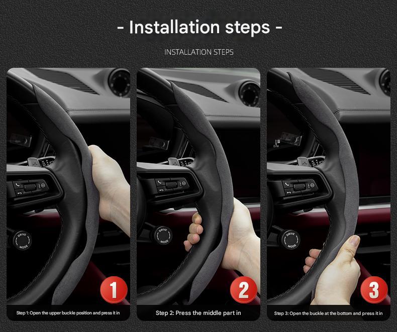 šćEasy Installationć: Our suede steering wheel cover adopts innovative segmented design, non-stick, and can be installed without damage in 15 seconds. It can be easily installed on the original steering wheel. First clip the left steering wheel cover on the steering wheel, and then put the right steering wheel cover on the steering wheel. The two-step installation and removal process is super fast.