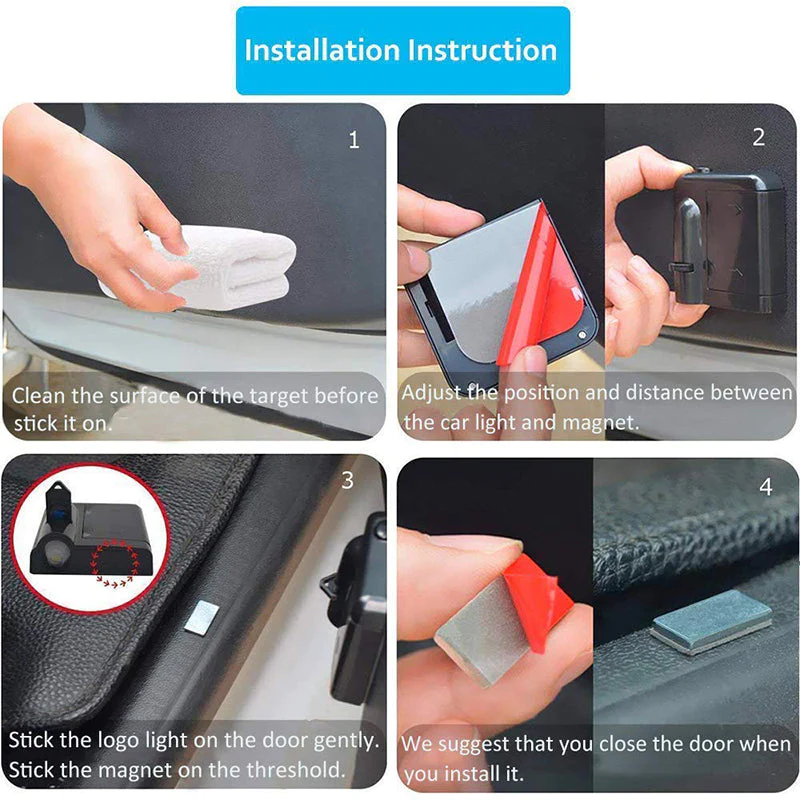 Easy installation. No need drill hole. Just stick the light lamp on the door panel and stick the magnet on the bottom of the car frame. The ground can illuminate the welcome light. No harm to car.