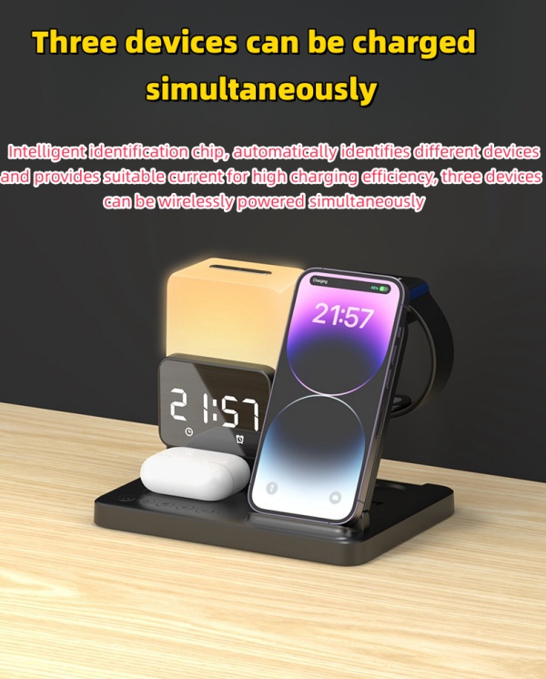 Intelligent identification chip, automatically identifies different devices and provides suitable current for high charging efficiency, three devices can be wirelessly powered simultaneously.