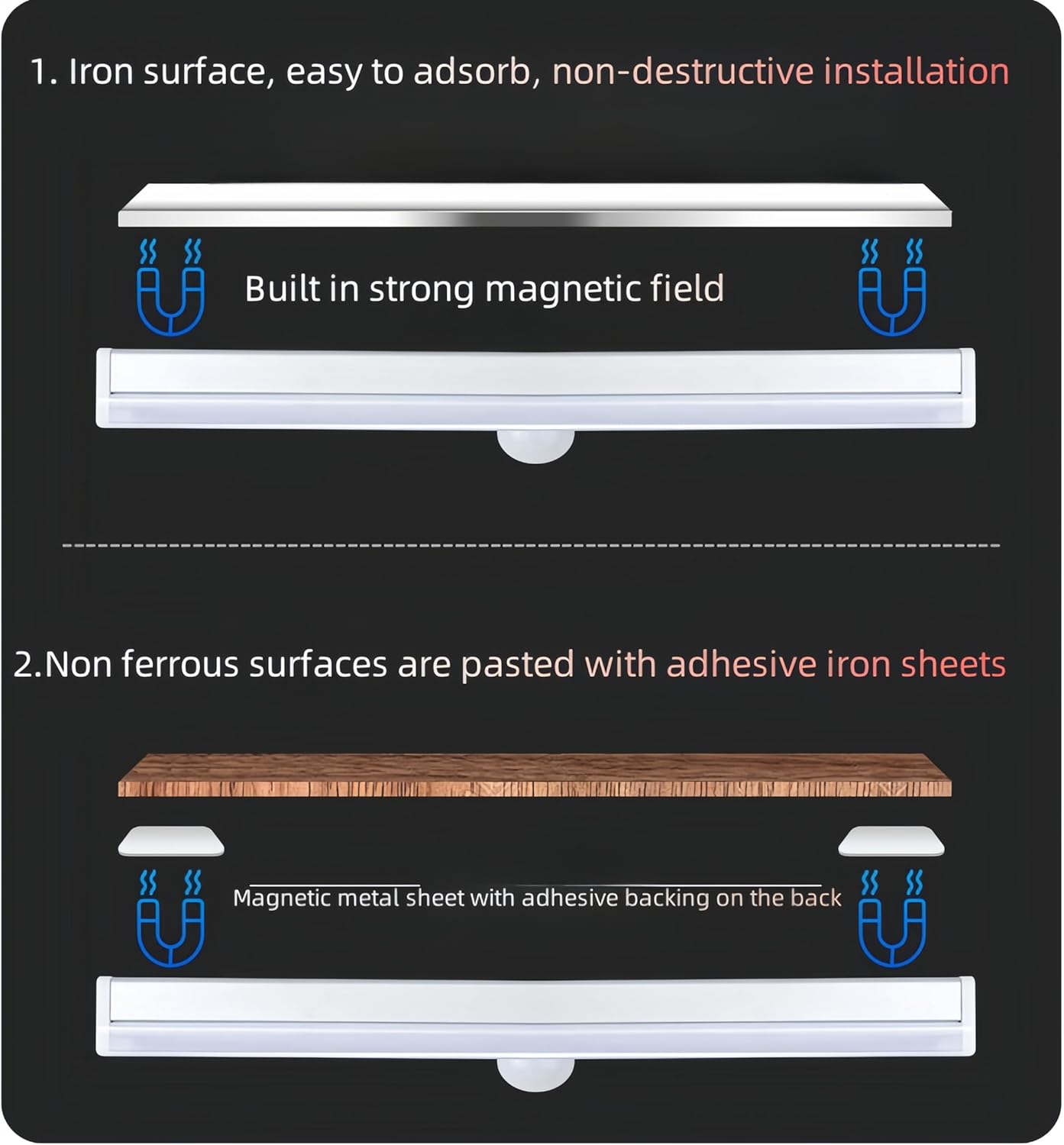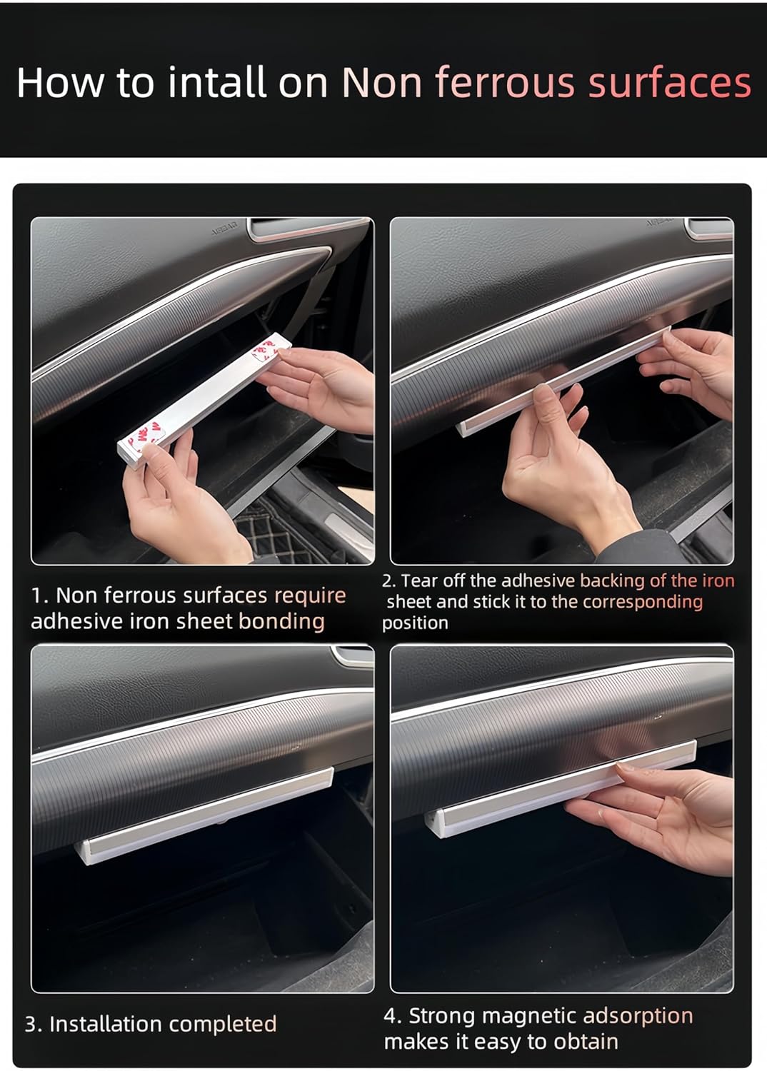 【Quick Installation】: First, peel off the double-sided tape protective paper behind the lamp. Then, glue the iron sheet in place. Finally, attach the light to the car roof and press it firmly to make the double-sided tape stick more closely to the sticking point.